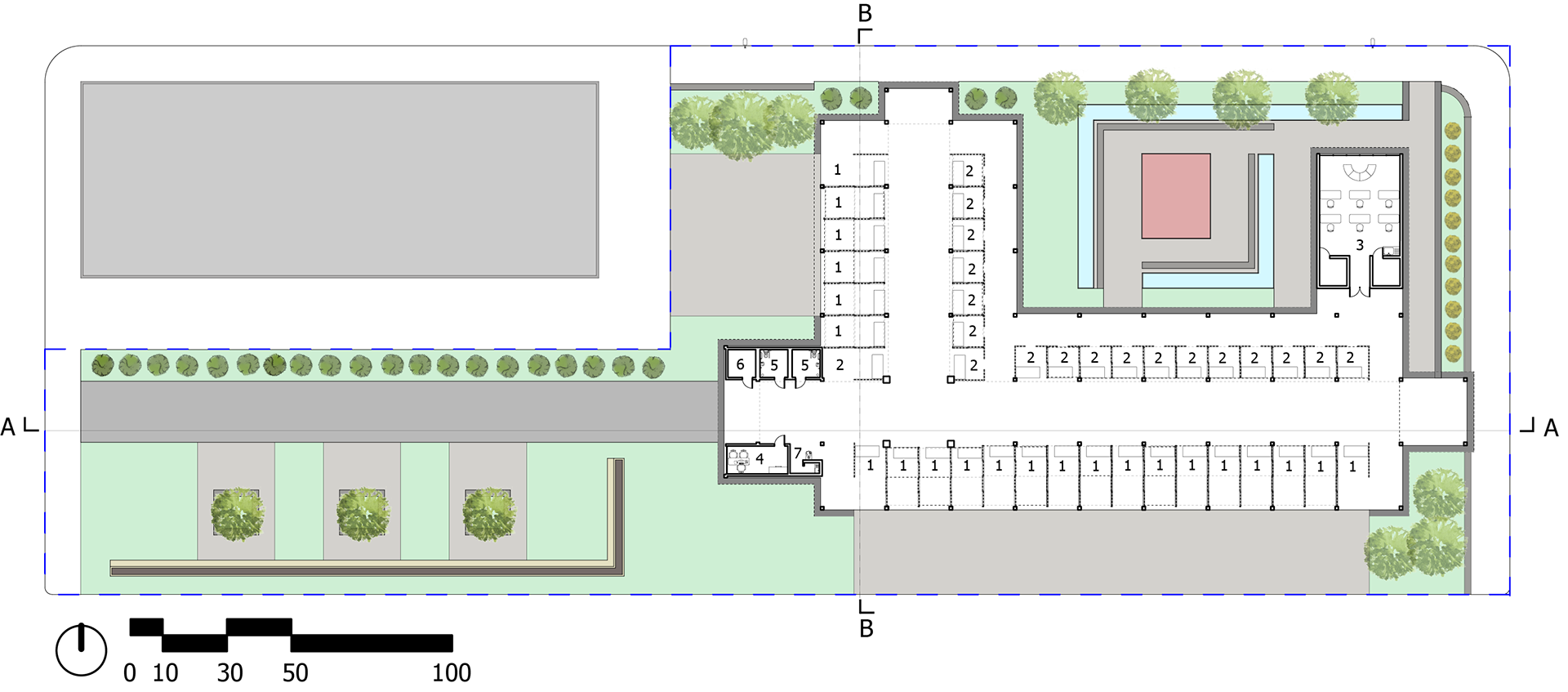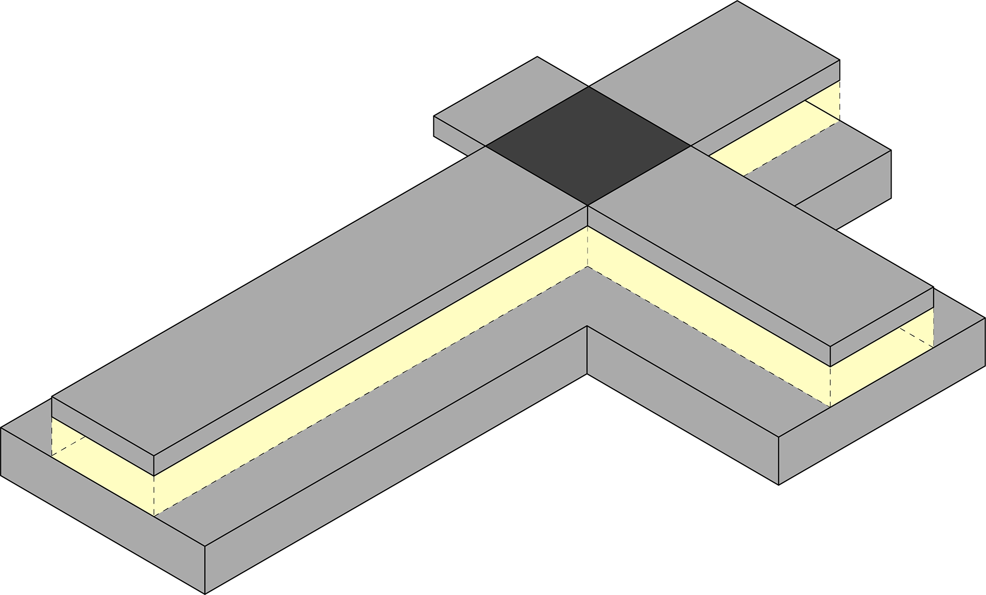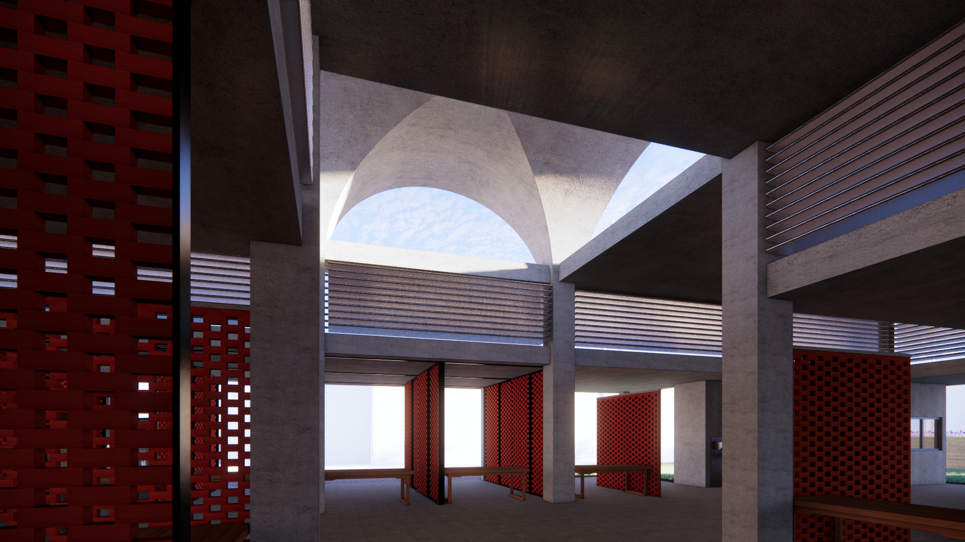 Two Rectilinear forms intersect to emphasize the intersection point. The design's intention is to spread and branch out to welcome all visitors from the north, west, and east. Lastly, the central area is dissected to allow for the negative space created to be filled with natural light that can illuminate the main aisle while still offering protection from the elements.