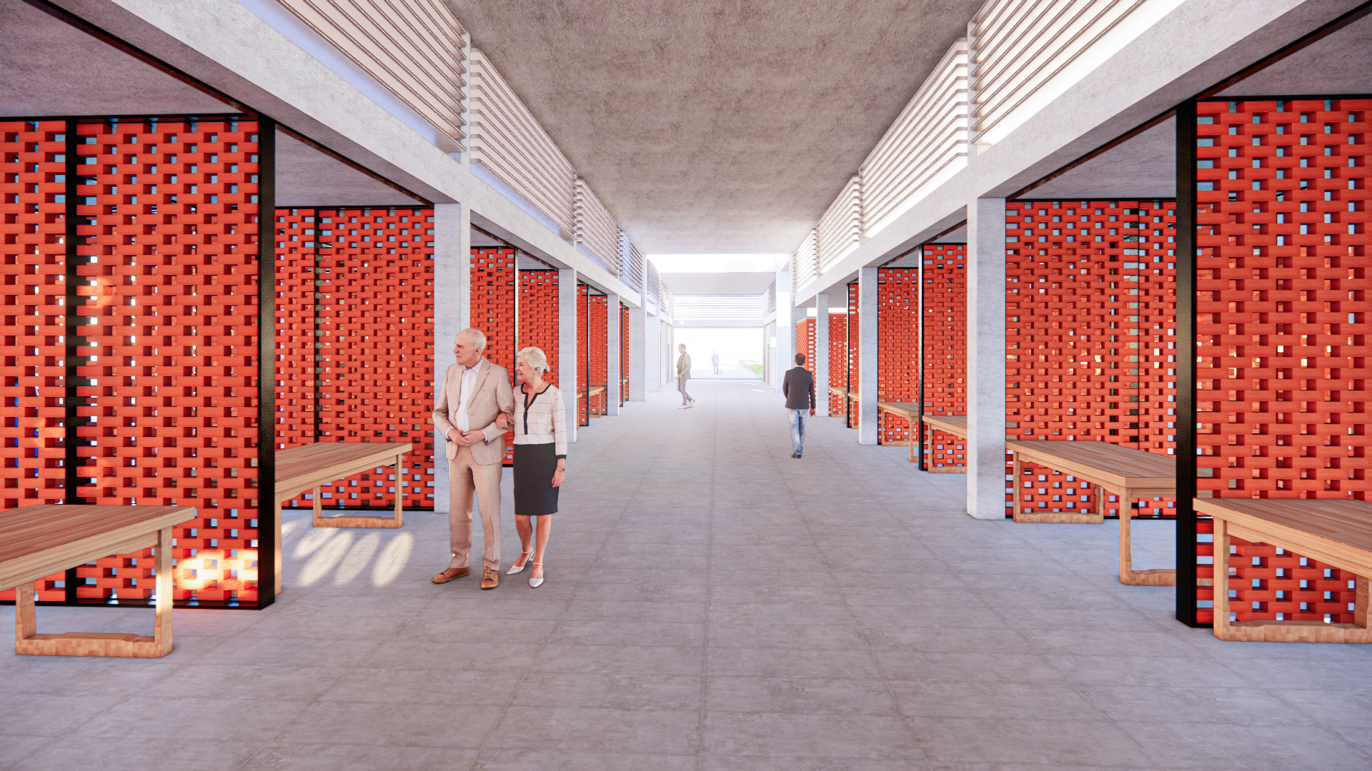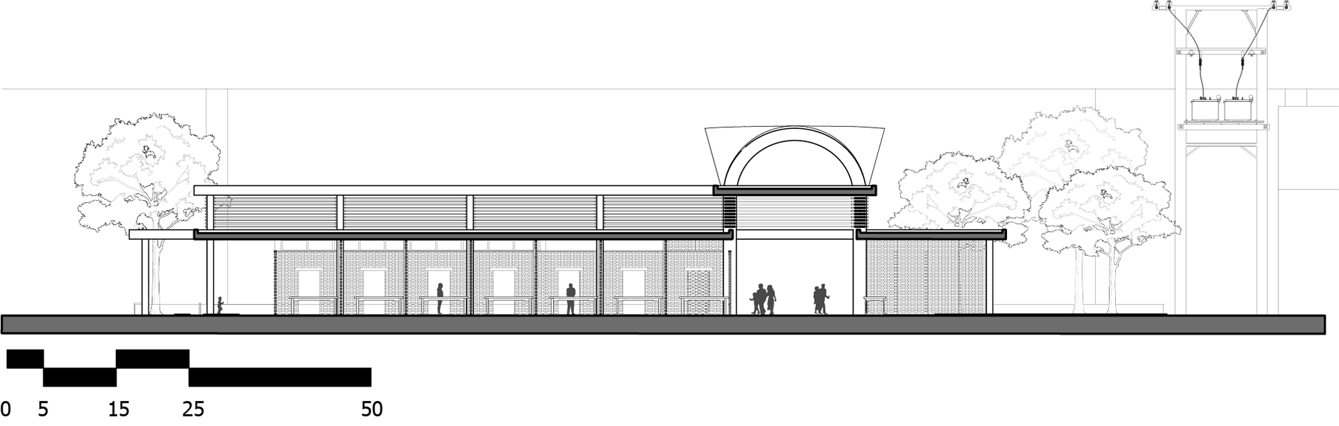 The design's goal to serve as a cultural icon is sustained for extended use due to the design's focus on environmental strategies with sustainability in mind. First, the concrete columns act as rain collectors. The rain-collecting columns also reuse the water and funnel it back into the water elements on the site. The introduction of the horizontal louvers breaks up the harsh light while still allowing the natural light in. The use of permeable pavement is also found in a major part of the landscape elements on the site. A permeable stone pathway is consistent in the main open gathering space on the site to allow for proper water collection as well as breaking up the stiff ground. The brick partitions were important in allowing for a sense of enclosure for each stall area while still not fully enclosing it. The openings allow for natural ventilation to come in and cool the stalls and main aisles. The landscape is also supplemented by the inclusion of native plants in Kansas specifically. The inclusion of viburnum shrubs and Linden trees helps the landscape, as well as helps, create a cultural icon for the local community.