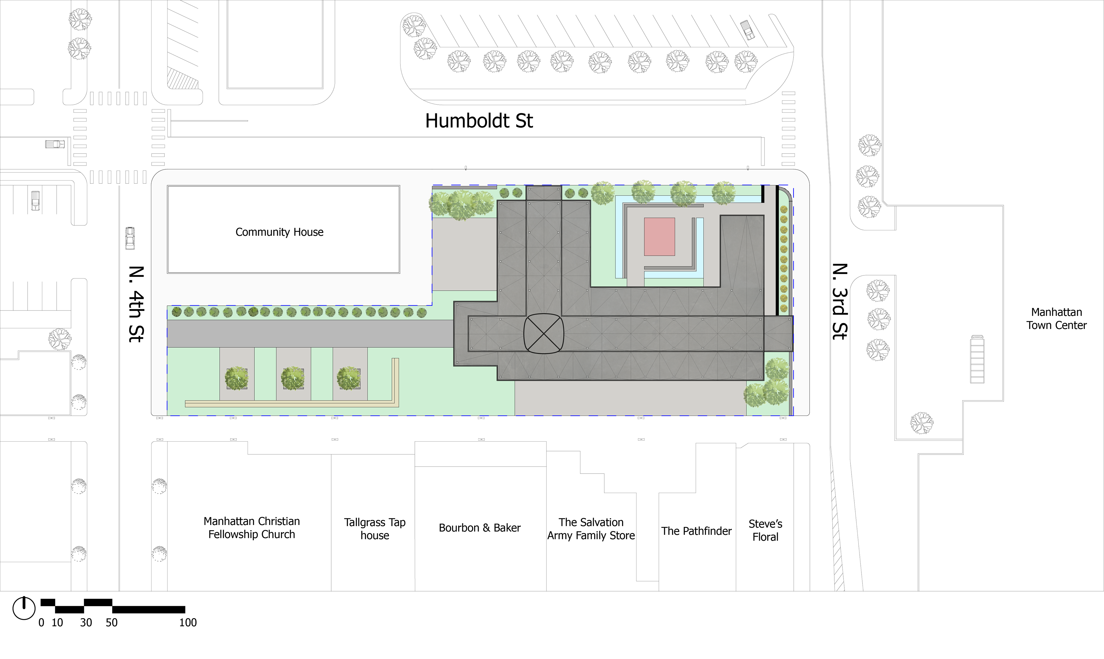 The main design goal of the 3-week project is to create a unique cultural epicenter for the Manhattan community. A special gathering space for all is the desired use of the farmers market as well as other variety of uses such as a movie night and surrounding landscape seating environments. The main idea of the gathering space came from the precedent research for the Gramalote Market Square. A lot of the inspiration for the design came from this market in Gramalote, Colombia. The Gramalote Market Square is set in a very unique context in a small town in Colombia that was mostly destroyed by a landslide caused by the “La Nina” phenomenon. With the town destroyed, the townspeople wanted to rebuild back stronger and used the Gramalote Market Square as the nucleus of the town. The main design elements that stuck out to really develop the sense of cultural identity were the multitude of entry points as well as many spaces to allow people to gather and interact with each other. The material palette was also influential as the brick partitions with the openings would allow natural ventilation into the market, which was a beneficial material use to have. The brick also reflects the community house, which most influences the building site. The concrete column and roof structure, as well as the rain collection aspect, were also influential in the design.