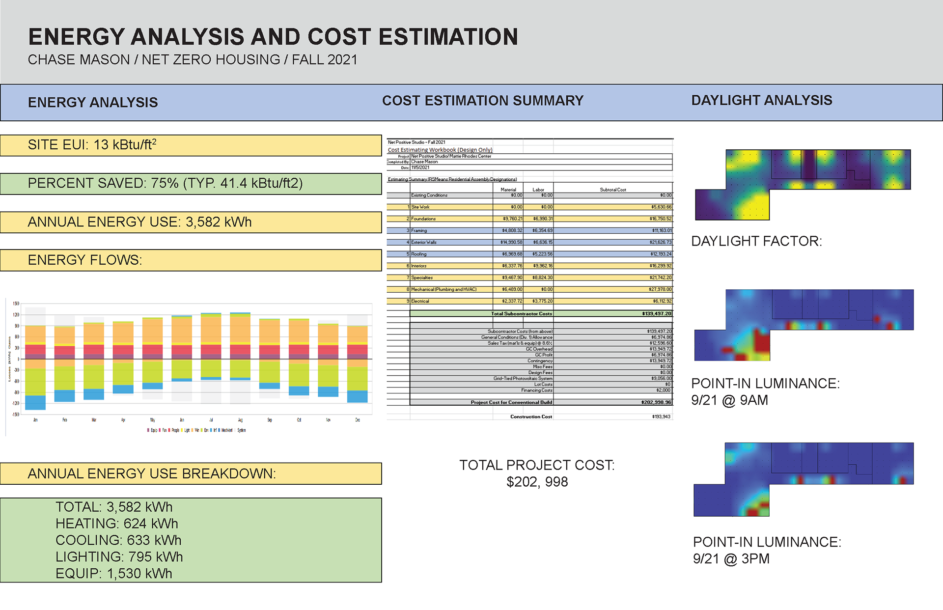 The main goal of the studio was pretty simple, to showcase that good design can also be affordable and even net positive. The ongoing housing crisis in the United States is a serious issue that as young architects we can help slow down and even hopefully one day stop. According to the U.S. Energy Information Administration "in 2020, the average annual electricity consumption for a U.S. residential utility customer was 10,715 kilowatt-hours (kWh), an average of about 893 kWh per month", meanwhile this home projects only 3,582 kWh annually energy usage with proper insulation, maintenance, and use. This studio really celebrated the true essence of why we do architecture. For people. Architecture at its roots is all for people and by people and by looking to strengthen and grow the communities around us we can create positive change in people's lives through the built environment.