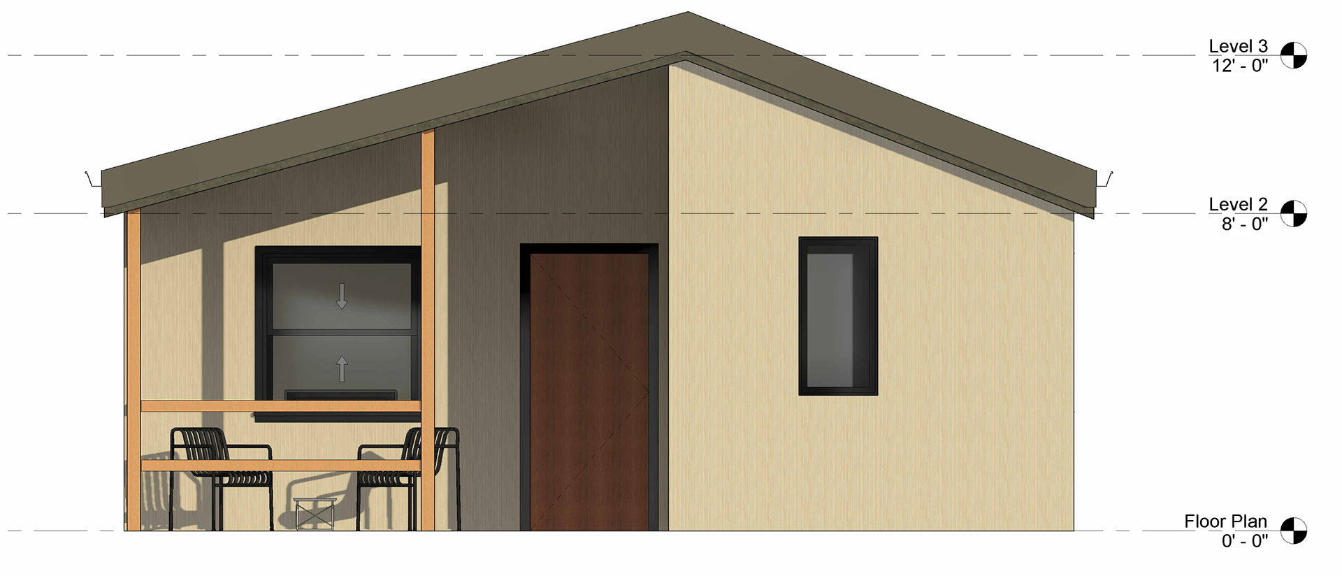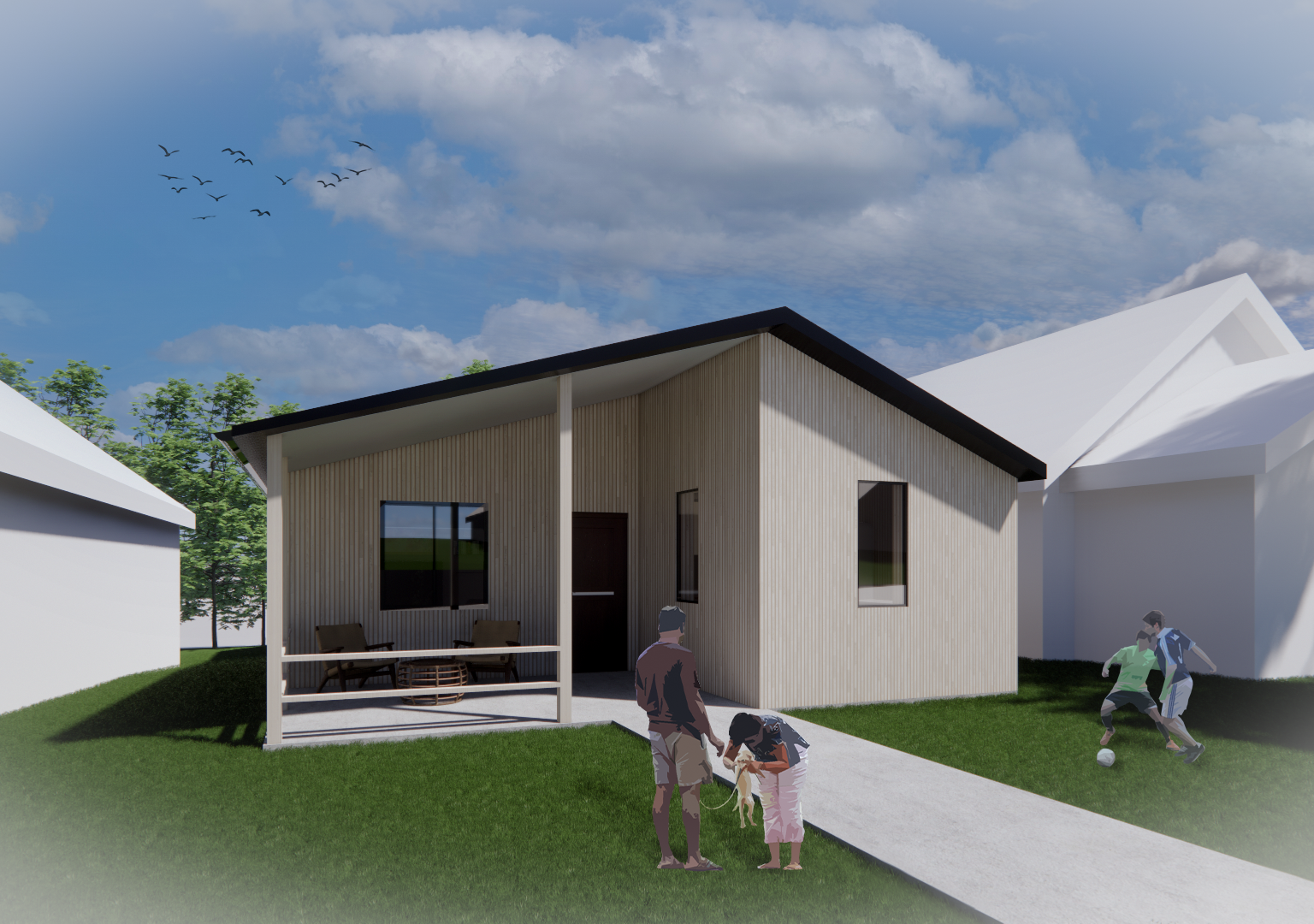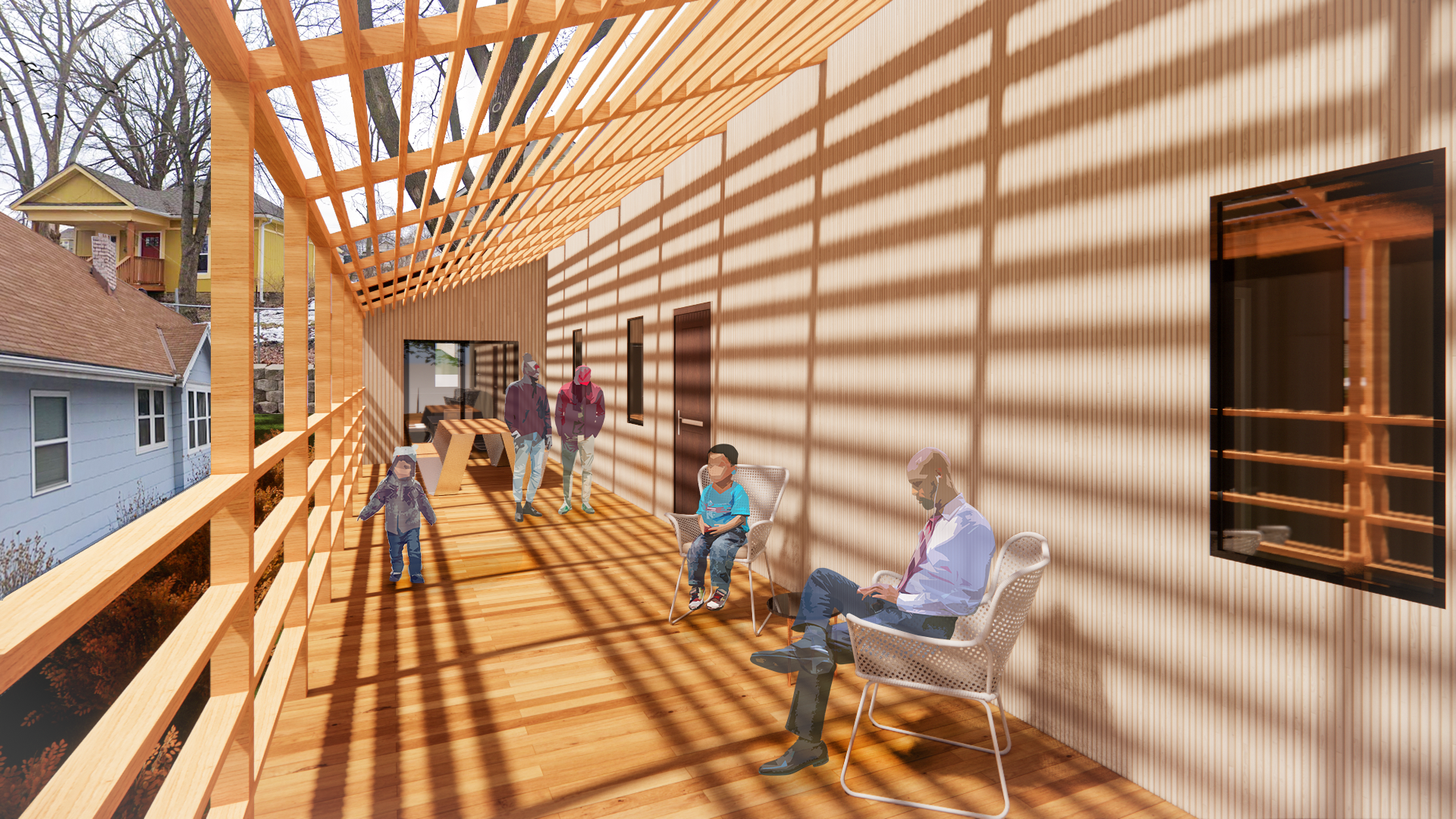 The overall conceptual move was to create a balance of outreach to the public (neighborhood and local community) but also a protected comfortable space for a family (parents and kids). One necessary target to hit on was maximizing square footage. Designing an affordable, net-zero home must include flexible spaces for experiences for the residents and guests while also maximizing overall comfort and safety for residents. This understanding led to the above diagrammatic overlay on top of the plan to show the frontal extension is for accommodating guests and social interaction within the community with the focal point being the front patio. The back part of the house is focused more on the relaxed aspects of day-to-day life including the bedrooms and bathrooms. With close communication with a local real estate agent, we found one way to increase value for the future residents would be to include a primary bathroom connected to the primary bedroom. The big moment created in the design is definitely the back patio space with the overhead elements. Created as a flexible outdoor space that can serve as a public gathering space including the connection to the kitchen and dining room to allow for large dining gatherings which was a request in our majority Latino community as they celebrate family, friends, and food often. One consideration of the back patio space was the overhead elements to create a more defined outdoor space and privacy in an area where lot sizes are long and narrow and you may be as close to your neighbor as 10 feet away. In inclusion to this move, the overhead elements also functionally act as a sunshade device while not disrupting the cross-ventilation while also creating shadowplay and overall a better experience for the users.