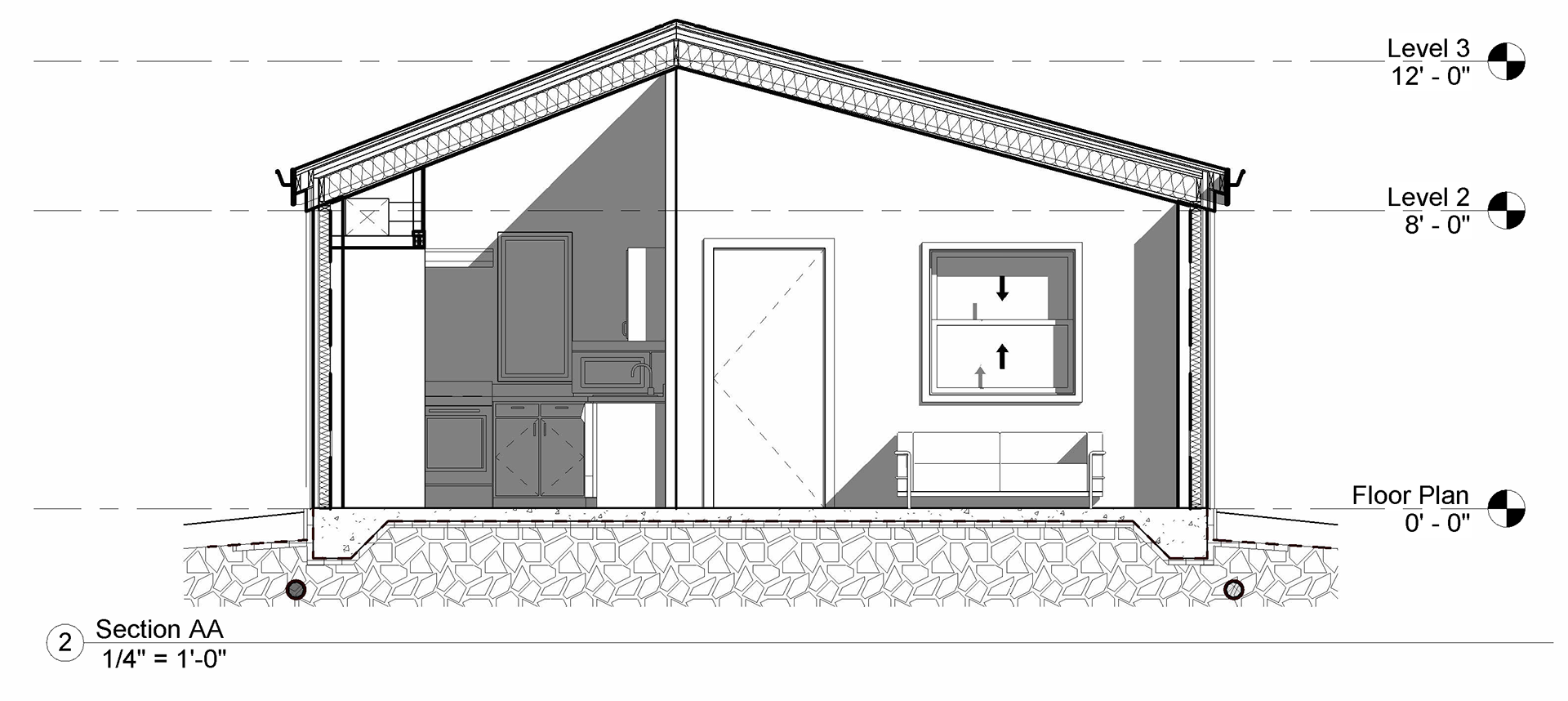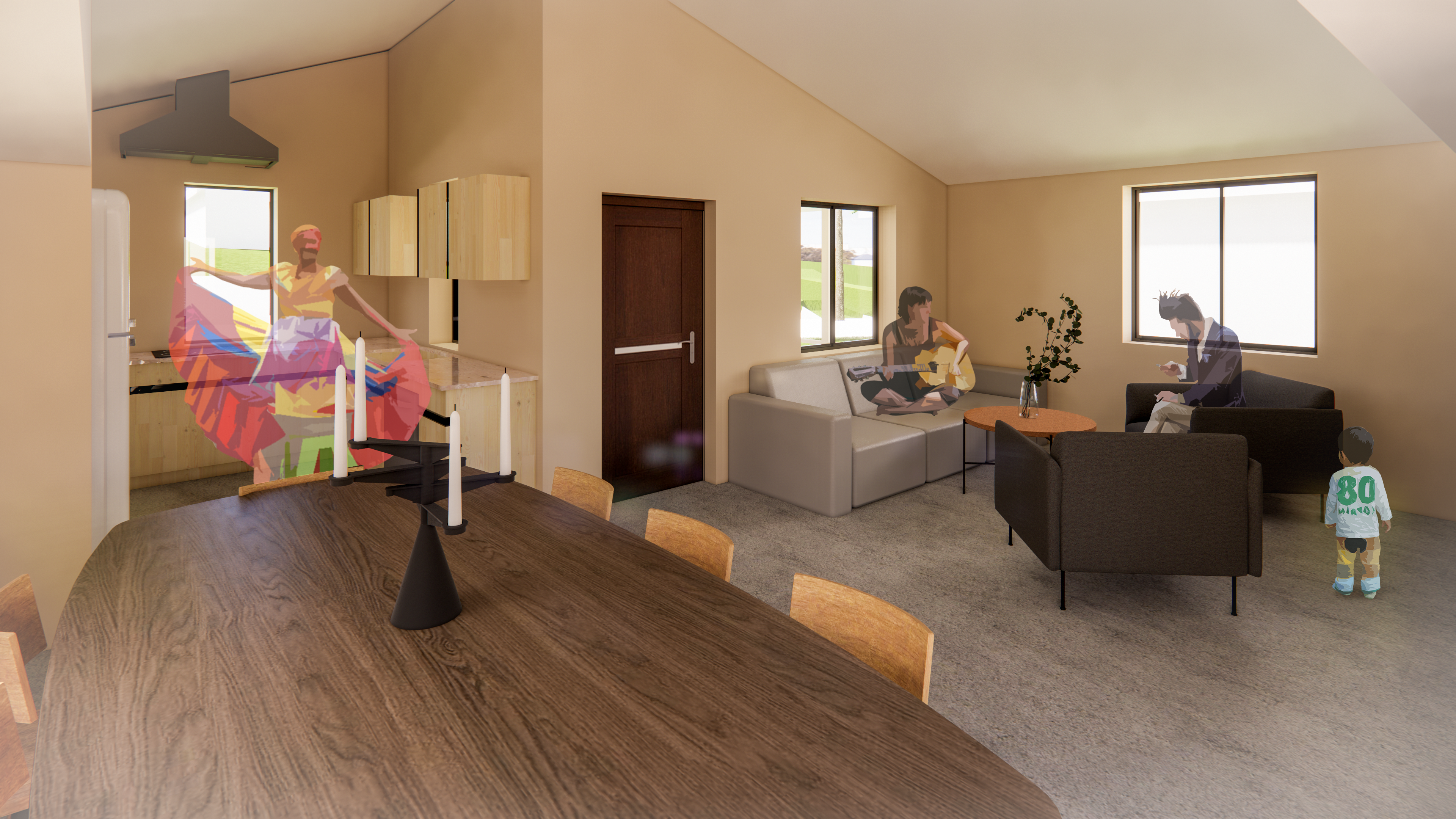The main goal of the living space was to maximize the experience within the cost-restricted frame of the project. By actively thinking of the location of windows for cross ventilation and natural light and using the best roof structure to create comfortable spaces to interact while not feeling cramped. This offers a clear view of the living space and how protected the private spaces are by the main hallway.
