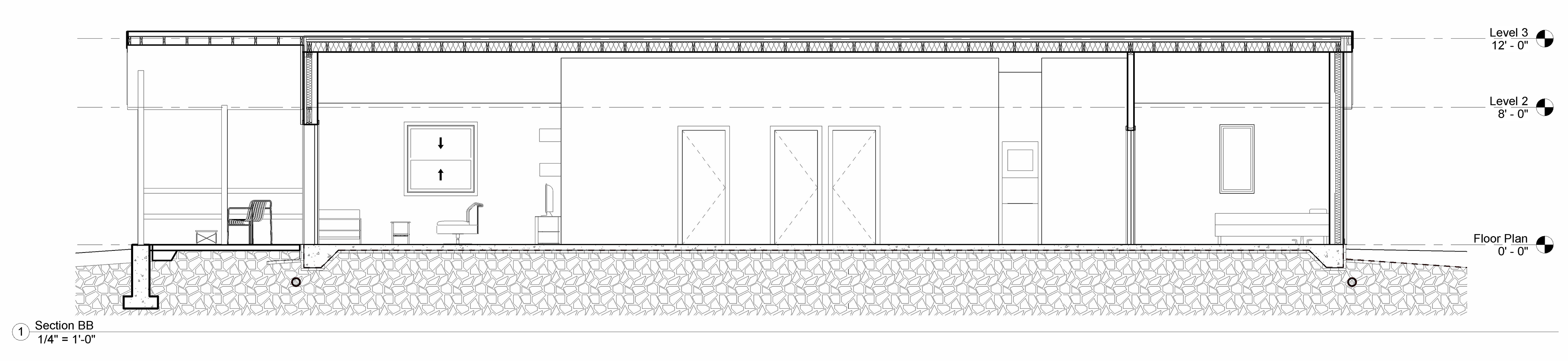 One of the biggest challenges of the site besides the slope was how narrow the buildable area was. A buildable area of 25' x 75' makes for a difficult way to keep and organize the spaces in a unique way. Ultimately, this led to the creation of the main core hallway to minimize the dedicated circulation space which is noticeable in the section above.